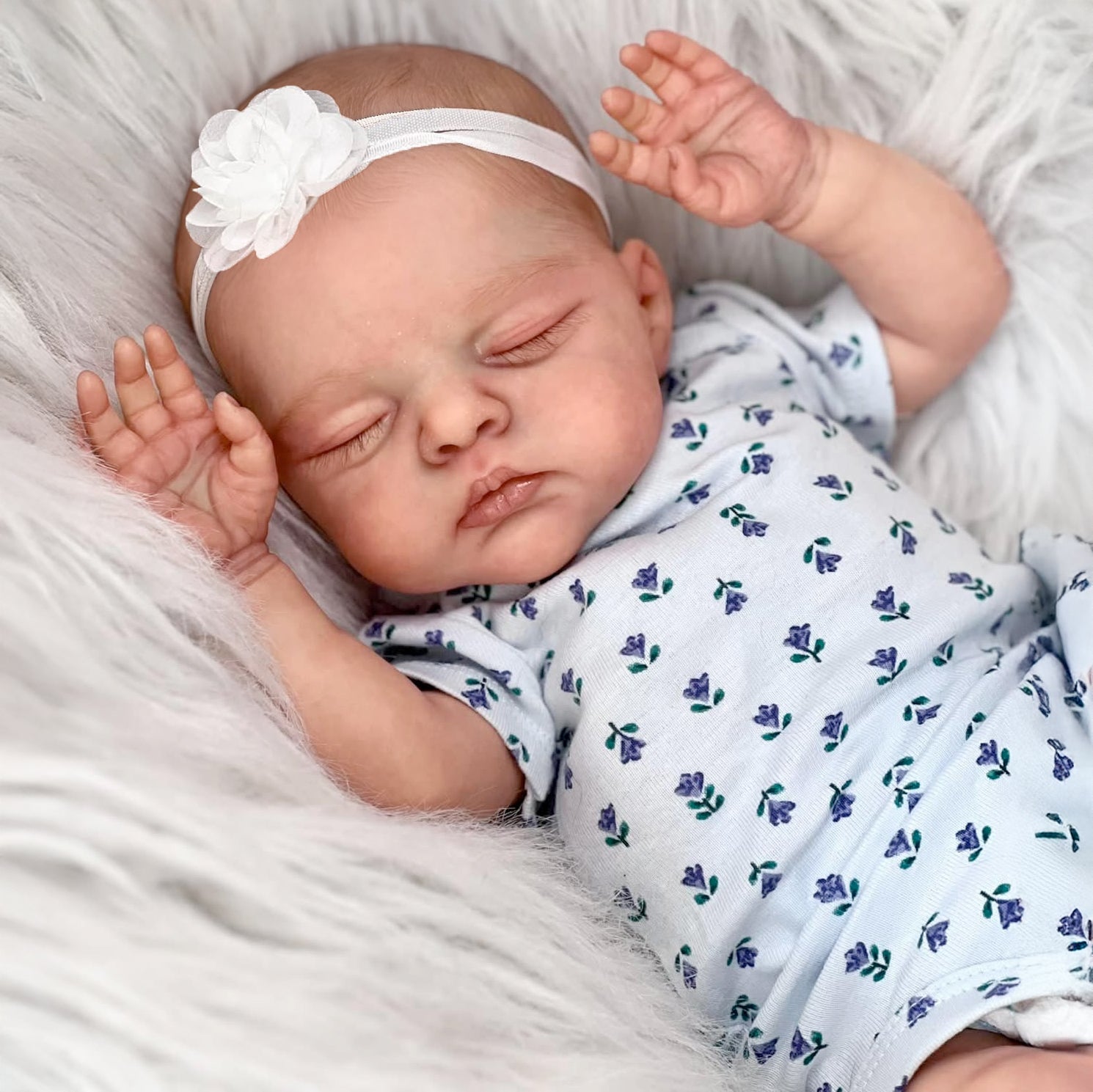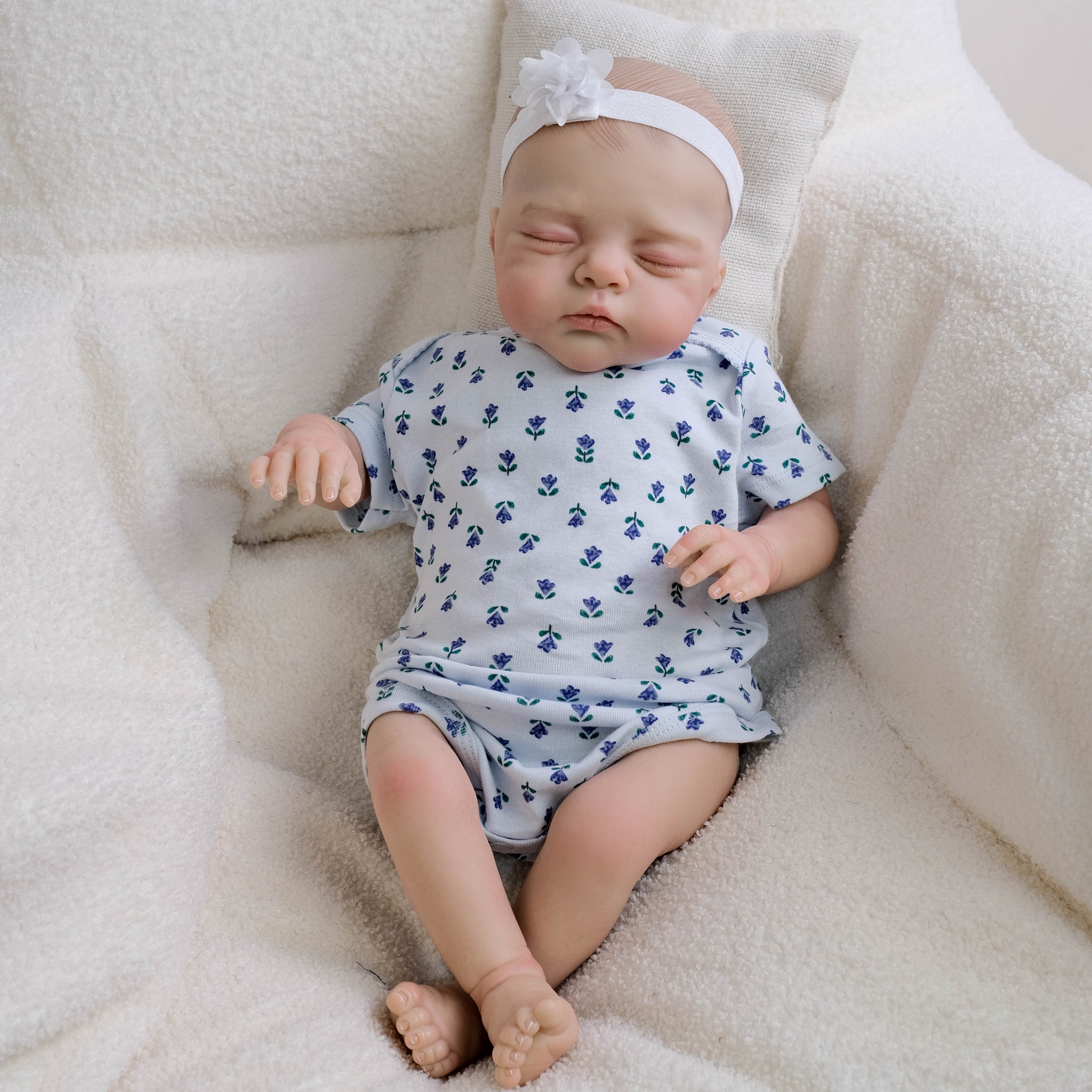 Irys is a 19-inch soft-body reborn doll featuring a meticulously hand-painted vinyl head that captures the delicate complexion and peaceful expression of a sleeping newborn. With her gently closed eyes and detailed facial features, she radiates serenity. Dressed in a purple floral short-sleeved romper and a white flower headband, she is both charming and lifelike.