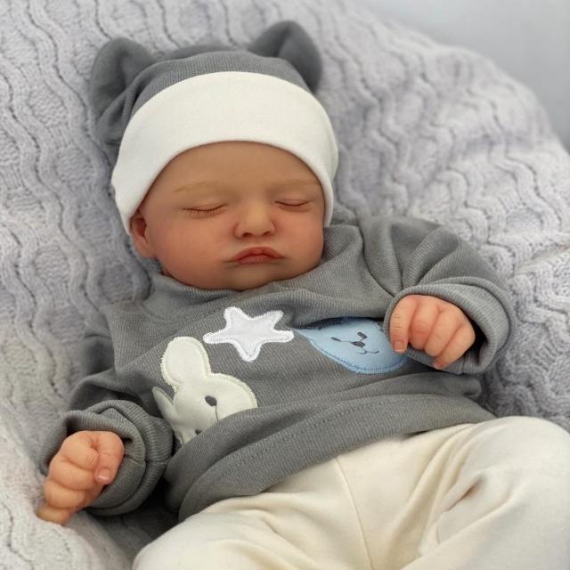 Lifelike Reborn Baby Doll - Full Vinyl Body with Hand-Painted Hair & Closed Eyes, Wearing Gray Outfit with Hat, Complete Feeding Set & Gift Box (18Inch)